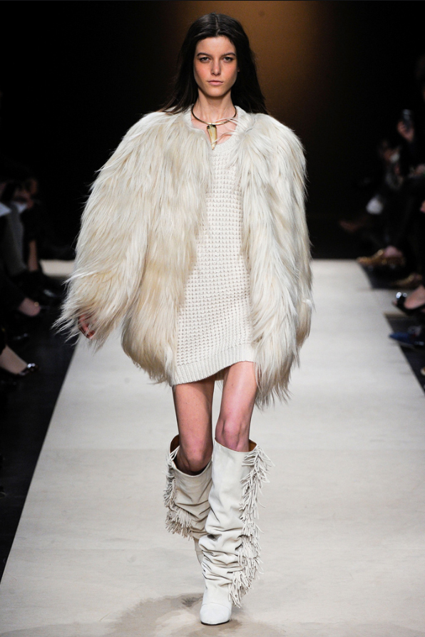 "Holy shit it's Big Foot!" That quote pretty much comes to mind when I see both these pieces. One is an ethnic yeti and one is a native yeti (promoting multiculturalism - I like it). Although the models legitimately look like Sasquatch strutting it down the runway, they still look fabulous and almost make me want to go out and don one.